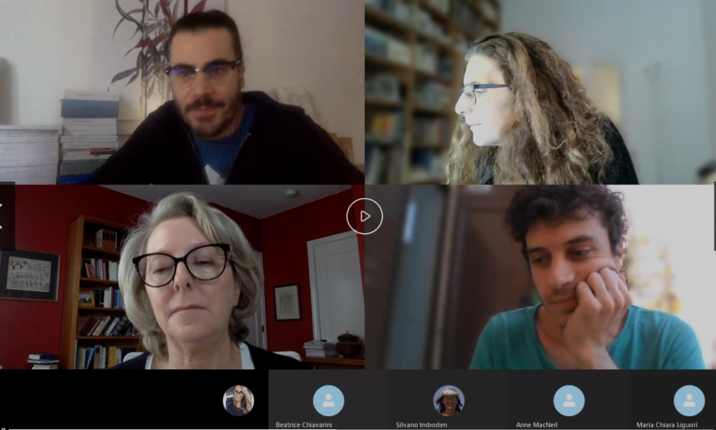 Ciascuno da casa propria, di qua e di la dall’Oceano, partecipa ai settimanali meeting di aggiornamento via Web. Giovanni, il regista, per non sfigurare nella sfida a chi ha più libri, è riuscito ad ordinarne diversi chili proprio prima del lockdown. Daniele ha optato, invece, per inserire sfondi virtuali a caso, in modo da confondere le acque.