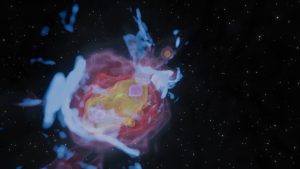 Con in mente l’obiettivo di produrre visualizzazioni che possano meravigliare, affascinare ed ispirare lo spettatore, immergendolo nella dimensione astronomica dell’evoluzione di galassie, siamo partiti da dei dati di simulazioni astrofisiche fornite dal gruppo MAGCOW del dipartimento di Fisica e Astronomia dell’Università di Bologna per creare una pipeline di analisi e visualizzazione scientifica dei dati stessi, sotto la supervisione di Giannandrea Inchingolo, membro del gruppo MAGCOW ed in collaborazione con lo studente Paolo Zuzolo (supervisione Serena Morigi, (AM)^2 research group – Dipartimento di Matematica, Università di Bologna). Il framework per la pipeline è stato incentrato sull’utilizzo della libreria di visualizzazione scientifica e 3D computer graphics VTK (Visualization ToolKit) con cui veniva definito un formato per i dati che permettesse di processarli, interagirvi e pre-visualizzarli. Queste ultime due operazioni sono state eseguite tramite il software open-source di visualizzazione scientifica Paraview, basato a sua volta sulla libreria VTK. Dopo questa prima fase di analisi dati e pre-visualizzazione, i dati sono stati successivamente elaborati in Blender per la realizzazione della visualizzazione finale. In quest’ultima fase sono state utilizzate contemporaneamente più tecniche di rendering, a seconda del tipo di dato, avvalendosi dei numerosi strumenti di compositing e video making disponibili.