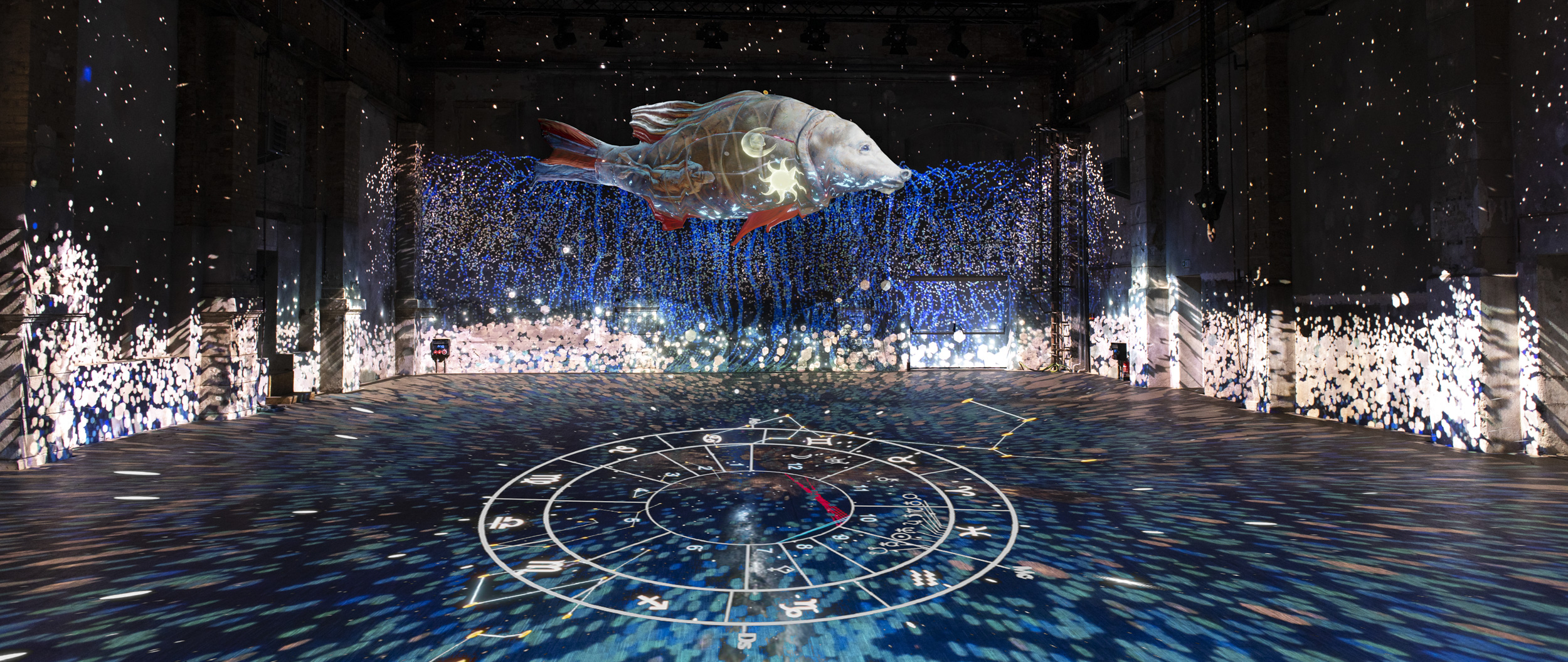 Sotto la guida artistica di Franz Fischnaller, abbiamo avuto la fortuna di collaborare alla produzione e arricchirla con le nostre competenze. Una delle sfide affrontate, per esempio, è stata la gestione dello spazio espositivo del Kunstkraftwerk, che è dotato di un sistema “watchout” di wallmapping con 25 proiettori per una superficie proiettata di circa 1200 metri quadrati ed una risoluzione del video per le pareti di 18000 x 2020 pixel. Per questo motivo è stata approntata una filiera apposita di rendering e video, via via riuniti e nuovamente suddivisi sulla base delle pareti e dei proiettori.