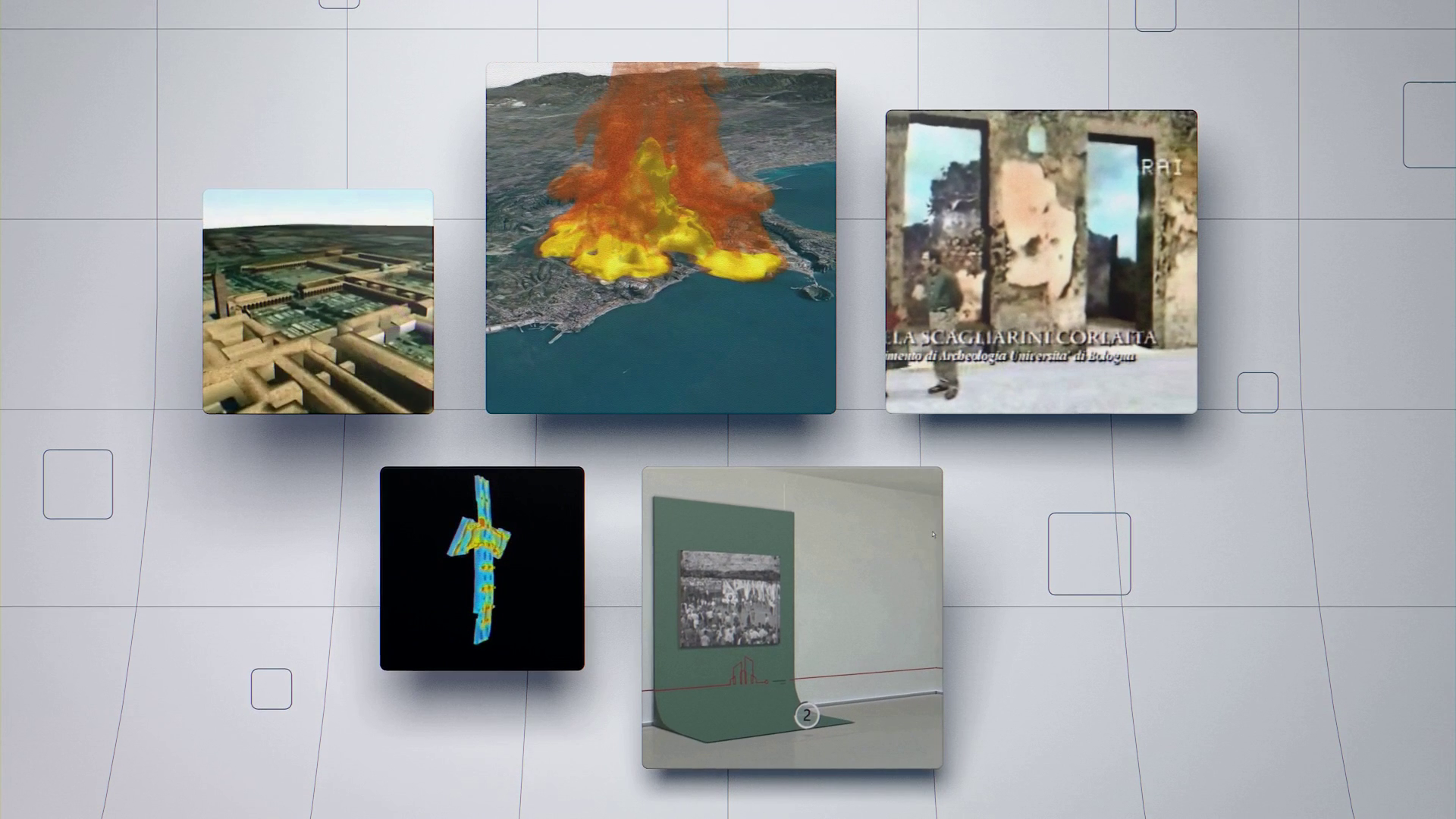 In apertura vediamo immagini dalle ricostruzioni del Museo Virtuale della Certosa di Bologna, per il quale abbiamo giusto iniziato un aggiornamento, e della Casa del Centenario di Pompei; la simulazione dell’eruzione del supervulcano dei Campi Flegrei, gli studi su un crocefisso di Giotto e le virtual gallery automatiche per il progetto I-Media-Cities. Si prosegue poi con la nostra Ati, protagonista di Experience Etruria; Apa, in Apa l’Etrusco alla scoperta di Bologna, e il piccolo Masaccio e Terre Nuove, prima di concludere la prima parte con lo spettacolo immersivo in olografia e 3D mapping dedicato al Sarcofago degli Sposi.